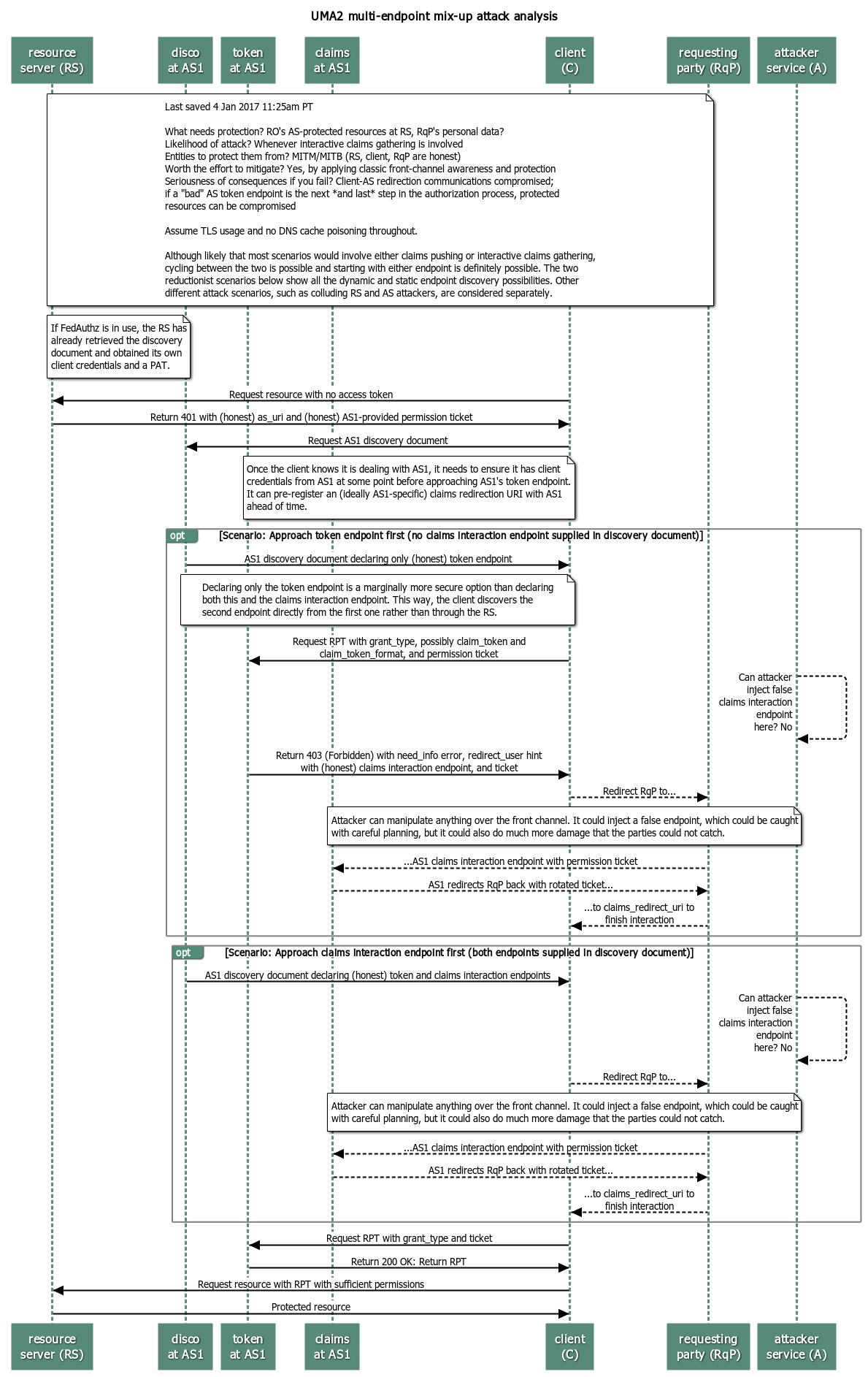 George/Eve/(implicit Robert from earlier in the day) discussion: The "UMA version" of a mix-up attack would have to start with the RS sending a wrong or malicious as_loc. Let's say a malicious RS wants to point all clients to a fake AS. The client now has discovered a false token endpoint (let's keep it simple; ignore interactive claims gathering for the moment) and POSTs to it. It comes back with a false RPT that allows the client to do everything. If the RO had already set up the RS with a good AS (authorizing PAT issuance), then the RS could get a permission ticket from *AS*(*good*) and send it and the as_uri for *AS*(*bad*) to the client – and potentially the later two protection API endpoint interactions too. But if there is a claims_redirect_uri-specific attack too, that's separate.